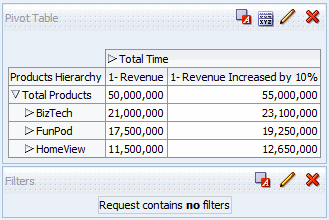 A column formula specifies what the column values represent. In its most basic form, such as "Base Facts"."1 - Revenue", a column takes the data from the data source as is. You can edit the formula to add functions, conditional expressions, and so on. This editing enables you to present analysis results in a variety of ways. For example, suppose that you want to perform what-if analysis and show what the revenue might be by product if you increased revenue by 10%. You can see this increase by changing the formula for the 1 - Revenue column to show the revenue increased by 10%. Figure 2-7 shows an analysis in a pivot table that includes the 1 - Revenue column (which shows the revenue in the data source) and the 1 - Revenue Increased by 10% column, where the formula for the 1 - Revenue column was edited to calculate revenue increased by 10%.