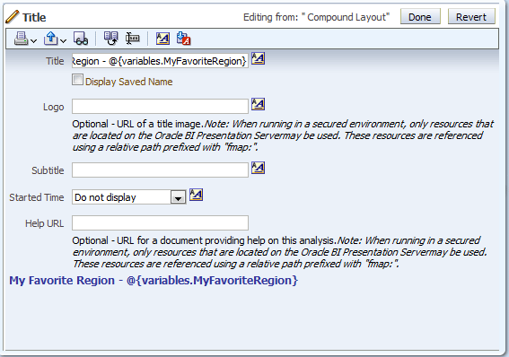 You can reference the MyFavoriteRegion variable in the Title view so that the user's selection in the Region prompt is displayed in the title of the analysis. To do so, you enter the variable syntax @{variables.MyFavoriteRegion} in the Title field in the Title editor, as shown in Figure 2-16.