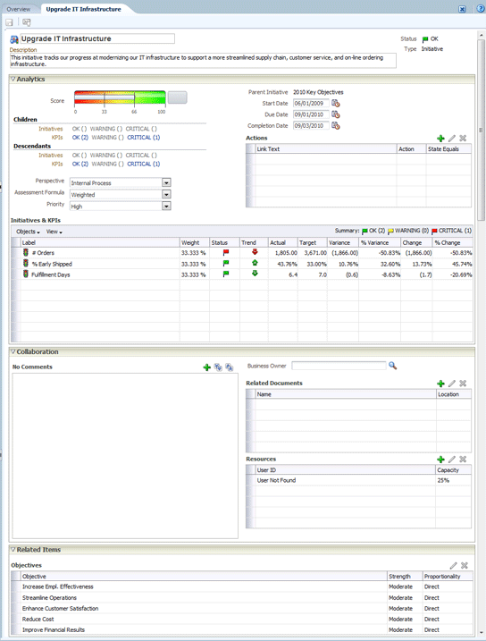 Best Practice: Use initiatives to track major milestones as a closed loop by assigning strategic objectives, taking remedial action by monitoring KPI targets and metric results, and using annotations and related documents for collaboration. |